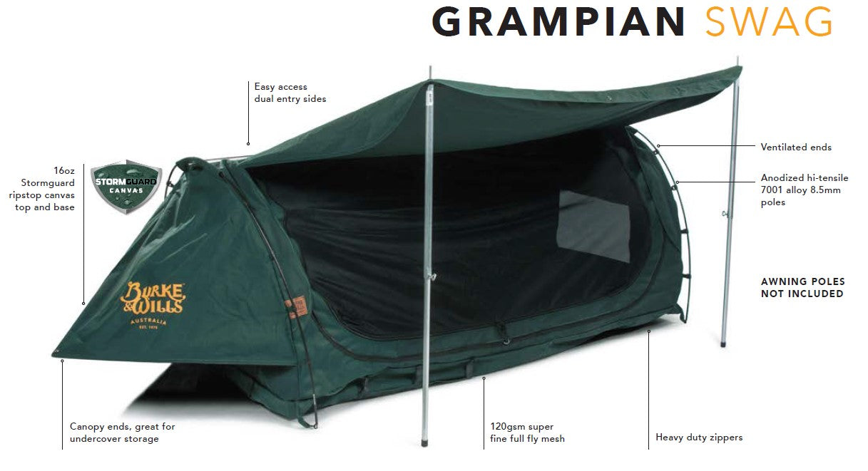 The Grampian Swag XL is a premium quality spacious free standing dome style swag, suited for all weather conditions.